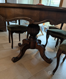 Splendido set Tavolo rotondo diametro cm 132 + 6 sedie con seduta in velluto verde. Per gli amanti del pezzo unico e dell'antiquariato di qualità, vendo raffinato coordinato d'epoca in stile Luigi Filippo/Umbertino. Il set è perfetto per un salone di rappresentanza o per essere inserito in un contesto di design eclettico.