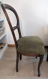 6 sedie modello "mongolfiera" coordinate. Struttura in legno solida, imbottitura e tessuto color verde salvia in ottime condizioni.