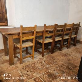 Vendesi importante tavolo in stile rustico/arte povera, realizzato in legno massello. Un pezzo di grande impatto visivo e solidità, perfetto per arredare una sala da pranzo spaziosa, una taverna o un porticato coperto.