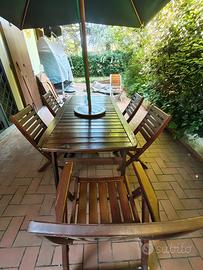 Tavolo allungabile da 4, 6 fino a 8 posti a seconda delle esigenze. Inclusa poltrona e 4 seggiole. Tutto Pircher. Incluso ombrellone che copre tutta la lunghezza del tavolo allungato e 2 seggiole extra per un totale di 7 seggiole. Inoltre dispenser vivande centrale rotante.