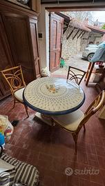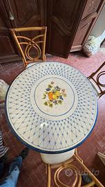 Set Tavolo Rotondo in Ceramica Dipinto a Mano con 3 Sedie in Midollino/Bambù