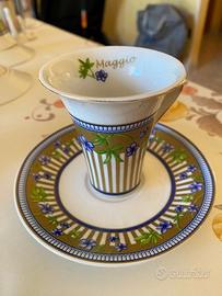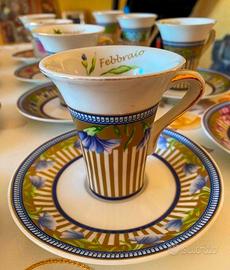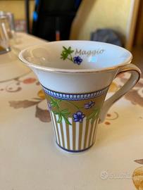 Vendo bellissimo set di tazzine da caffè vintage Made in England, porcellana fine pregiata del 1969. Set NON nella scatola originale. Le tazzine rappresentano i 12 mesi dell'anno. Dimensioni, Tazzina cm. 9x6,5x5,5 - piattino cm. Ø12x2. Tazzina e piattino hanno un delicato motivo floreale, tazza bianca con fiori lilla, rifiniture dorate. Nella foto n. 5 una tazzina presenta un difetto di fabbrica ( la vernice ha lasciato il bordo macchiato ). Ritiro a mano in zona Lanciano oppure Pescara. Prezzo trattabile.