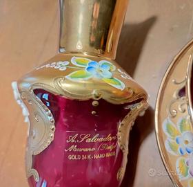 Franco Salvadori è un maestro vetraio specializzato nella tecnica decorativa conosciuta come dei ‘tre foghi”, ovvero “tre fuochi’ tipica della tradizione veneziana del vetro di Murano. Le opere di cristalleria realizzate sono di alta qualità, realizzate una ad una, rigorosamente a mano, soffiate e finemente dipinte a mano con fiori sporgenti sulla superficie per dare un effetto artigianale unico. Il risultato è, infatti, un prodotto in vetro con smalti a base di polvere di vetro e oro 21 carati.