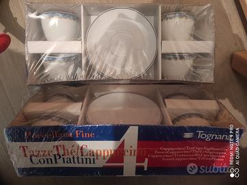 vendo 2 set da 4 pz ciascuno di tazze e piattini da thè/cappuccino in porcellana fine, marca Tognana. imballati nella confezione originale, nuove mai usate. € 9 x 1 set, € 15 x 2 set