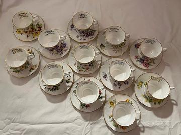 tazze da tè vintage in porcellana inglese Bone China, caratterizzate da motivi floreali.