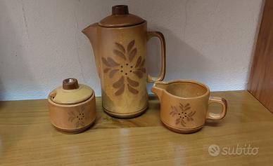 Set 6 tazzine con 6 piattini, contenitore per caffè e latte e zuccheriera in terracotta.