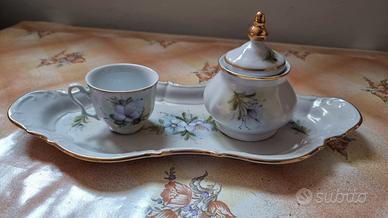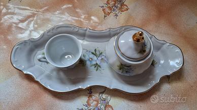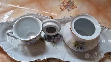 Elegante set composto da una tazzina e una zuccheriera, perfetto per un momento di relax. - Decorazioni floreali dipinte a mano. - Bordi rifiniti in oro.