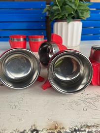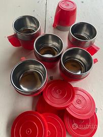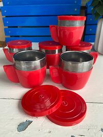 Sei tazzine termiche anni 70 space age utilizzate nei bar per il caffè espresso d’asporto tutte dotate del loro coperchietto. Perfettamente integre internamente in acciaio lucido ed esternamente in plastica rossa. Prodotte dalla ditta Inoxriv made in Italy . adatte per esposizione in un bar ma anche in casa per dare un tocco vintage.
