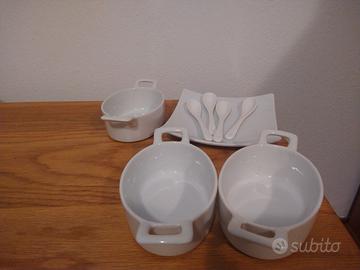 Vendo set marca SELETTI composto da 6 tazzine da caffè + palettine, vassoio, biscottiera, zuccheriera e contenitore per il latte. Sono comprese anche tre ciotole con cucchiaini per aperitivi marca FADE.