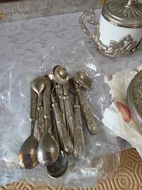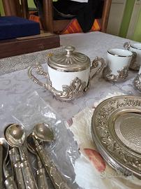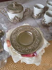 Vendo set composto da 12 tazzine per caffè in ceramica (made in italy) e argento 800 (mancante di una tazzina), 12 piattini, 12 cucchiaini ( 2 rotti), zuccheriera. Accetto offerte.