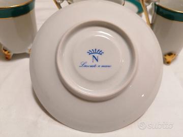 Set composto da 6 tazzine da caffè e 3 piattini in porcellana "N" lavorata a mano, come da foto. Ottime condizioni, senza difetti, usate pochissimo. Eventuale consegna a mano zona Napoli Vomero oppure disponibile spedizione. Contatti anche su WhatsApp 3336493778