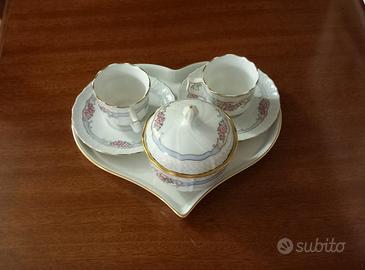 Set vassoio a forma di cuore con due tazzine usate come arredamento vetrinetta, si possono usare per sorseggiare un buon caffè in buona compagnia
