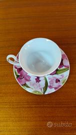 Elegante set da caffè realizzato in fine porcellana, nuovo, mai utilizzato, composto da sei tazzine e sei piattini. Il marchio LG Limoges è molto conosciuto per la realizzazione di servizi da tè e caffè di alta qualità. Le tazzine LG Limoges sono realizzate con porcellana molto pregiata, color bianco puro, consistenza fine e delicata. Presentano motivi floreali con dettagli in oro zecchino. Diametro tazza cm. 7, diametro piattino cm. 12.