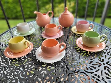 Vendo set 6 tazzine con i loro 6 piattini più zuccheriera e lattiera nuovi. Colorato e simpatico. Nessun difetto. Senza confezione perché tenute nel mobile.