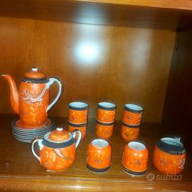 Il set include 10 tazzine decorate e con radianti colori + piattini + zuccheriera + contenitore latte con i rispettivi coperchi + contenitore acqua
