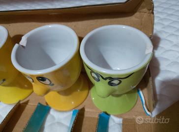 "set tazzine porta uova in ceramica 6 pezzi:2 con piccoli difetti (sbeccate)e 4 sono perfette (con scatola originale),per servire le uova sode o alla coque a colazione