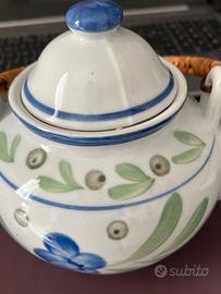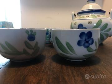 Teiera con manico in bambù e disegni floreali+ 4 tazzine a coppetta. In perfetto stato. Lavabile in lavastoviglie.