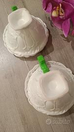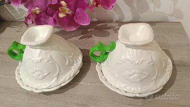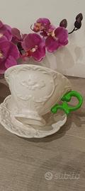 Set da tè per 2 persone I-WARES I-TEA by Seletti, composto da 2 tazze da tè + due piattini (no cucchiaini) di ispirazione barocca. In fine porcellana opaca con finitura bianco mat e manici verdi fluorescenti.