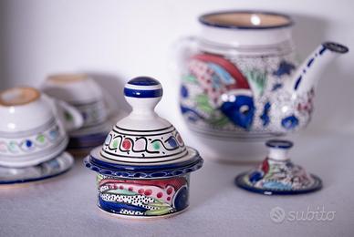Servizio da te artigianale in ceramica smaltata decorato a mano. Teiera, zuccheriera, 6 tazze, 6 piattini.