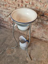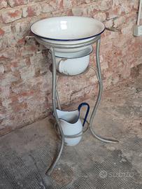 Le condizioni sono discrete: la struttura in metallo presenta alcune parti con ruggine; vi sono alcune ammaccature e segni di usura sugli smalti di catino, brocca e vaso da notte. Ritiro a carico dell’Acquirente a Milano, zona Bicocca.
