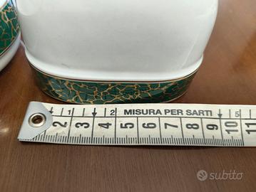 Esclusivo set coordinato firmato Trussardi Events, realizzato in pregiata porcellana bianca. Il design elegante "Home Decor" presenta una decorazione a fascia verde con trame dorate e finiture in oro zecchino.