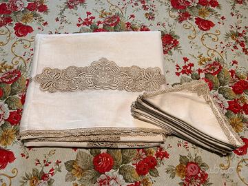 Tovaglia di lino écru con pizzo di Cantù + 12 tovaglioli. Usato solo una volta, senza imperfezioni.