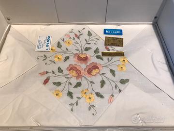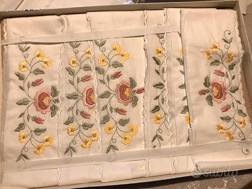 Vendo set Bassetti ricamato a mano Arte Fiorentina per 6 persone, NUOVO mai aperto, contenuto in baule composto da: tovaglia e tovaglioli, asciugamani, lenzuolo matrimoniale con federe e copriletto.