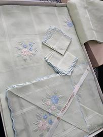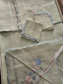 Elegante set di tovaglia e tovaglietta da tè in battista di puro cotone ricamato a mano. Perfetto per il pranzo pasquale. Il set include una tovaglia per 12 persone più 12 tovaglioli e una tovaglia da te 90x90 con sei tovaglioli piccoli. Misure in foto. NON spedisco con Poste Italiane .