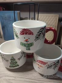 Set di 3 tazze natalizie decorate a mano con motivi festivi (Babbo Natale, albero di Natale e pupazzo di neve).