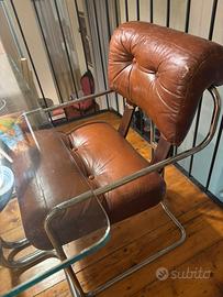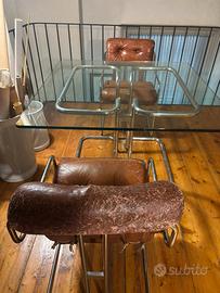 Set completo Tucroma di Guido Faleschini per 4Mariani, 1970 ca. Tavolo in cristallo. Due sedie in pelle (una necessita di reatauro professionale al rivestimento).