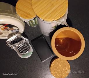 Utilissimo ed originale set utensili da cucina, come da foto, così composto: n. 1 barattolo grande marca Brabantia, in vetro borosilicato rinforzato, con coperchio in bambù, che ne garantisce una chiusura ermetica, grande marca Brabantia, 1700 ml; n. 1 barattolo stessa marca e materiale, 700 ml; n. 1 contenitore in vero Coccio, tappo in sughero molto capiente, ideali per conservare perfettamente i Vs alimenti, unendo utilità ed eleganza; n. 1 bilancia elettronica di precisione portatile/tascabile ad alta precisione, 500g/0,01 gr, funzione tara display con retroilluminazione, dotata di coperchio protettivo in ABS ribaltabile per il piatto di pesata; n. 1 affetta uova, in acciaio inox; n. 1 confezione, integra, 4 in 1 di contenitori ermetici per alimenti da 0.6 ml, con coperchio, in plastica senza BPA, adatti per frigorifero, congelatore, microonde e lavastoviglie, incastrabili uno all'interno dell'altro per comodità salvaspazio. Casalinghi dalle Linee particolari e ricercate, materiali resistenti, alta qualità e grande gusto, indispensabili in cucina, forniranno un grande aiuto per conservare, con facilità gli alimenti, rendendo semplice e pratica la preparazione delle vostre pietanze. Nuovi, mai utilizzati. Ritiro diretto, pagamento contanti.