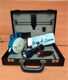 Set composto da valigetta, tre lampade, cavo TV avvolgibile e targhetta scherzosa.