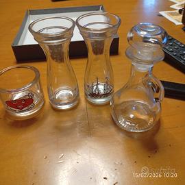 Due vasetti o bottigliette in vetrocon una forma svasata e decorazioni, spesso usati per servire condimenti come olio o aceto.