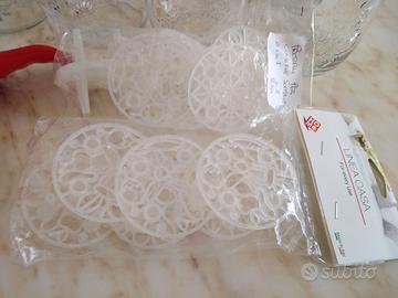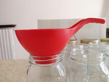 N. 12 vasi grandi Bormioli per conserve da 1000 gr., 4 tappi diam. 86mm. , pressini e imbuto Bormioli. Tutto nuovo, mai usato.