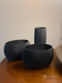 Questo tris di vasi si ispira alle linee pulite ed essenziali dello stile nordico e Japandi, aggiungendo un tocco di eleganza e sobrietà a qualsiasi ambiente. La finitura nera opaca e la texture a costine verticali creano un affascinante gioco di luci e ombre che cattura lo sguardo.