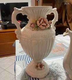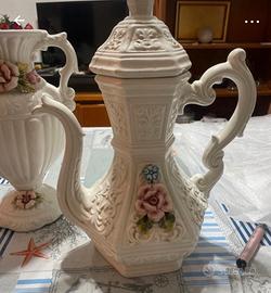 Set composto da un vaso ornamentale e una brocca decorativa con coperchio in ceramica bianca con fiori color pastello in rilievo.