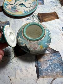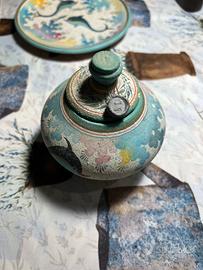 Vendo bellissimo set artigianale composto da piccolo vaso con coperchio e piattino coordinato, splendida riproduzione dello stile delle antiche ceramiche Cretesi (Minoiche).