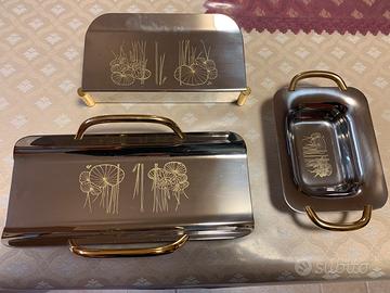 Set di tre vassoi rettangolari decorati in acciaio , completo di portatovaglioli,portapane e ciotola (48x33 -43x30 -38x27)