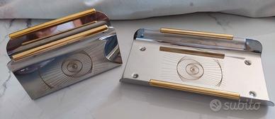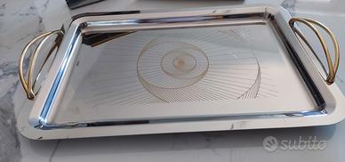 Set vassoio+portatovaglioli e portagrissini in acciaio inox 18/10, con serigrafia geometrica su ogni pezzo. Ottime condizioni.