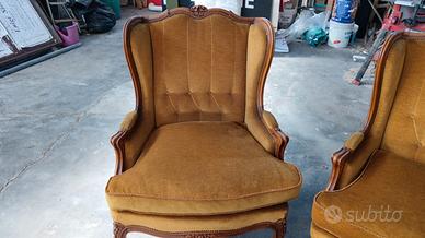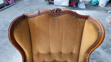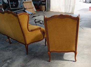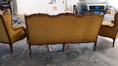 Vendo set composto da un divano a 3 posti e due poltrone. Il set è vintage (anni '70), di artigianato italiano in stile rococò, composto da struttura in legno lavorato con intagli floreali e copertura in tessuto color giallo mostarda. Dimensioni Divano: - altezza 108 cm - larghezza 195 cm - profondità 68 cm Dimensioni Poltrone : - altezza 108 cm - larghezza 82 cm - profondità 68 cm Il tutto è in ottime condizioni con pochi segni del tempo. L'oggetto si trova a Magenta (MI). Previo accordo, è possibile effettuare il ritiro a mano o fare una consegna (con maggiorazione di prezzo). Il tutto da concordare tramite chat di Subito. Non ritirabile durante l'orario dei pasti. Per il pagamento accetto contanti, bonifico bancario, PayPal o altri metodi da concordare. Per domande, chiarimenti e qualsiasi cosa vi passi per la testa sul materiale, contattatemi!