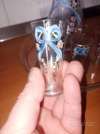 Set Vintage composto da vassoio,4 bicchierini e 1 bottiglia con tappo in vetro sottile e dipinto a mano.