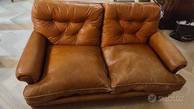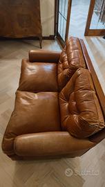 Set vintage in vera pelle, composto da un divano a due posti e due poltrone, con imbottitura tipica degli anni ’60/’70.