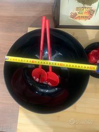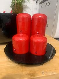 Set vintage di Guzzini Rosso e Nero ,serie Pomona Designe Ambrogio Pozzi anni 80 composto da :grande insalatiera con posate, set per olio,aceto , sale , e pepe