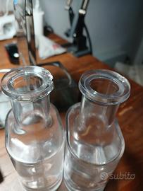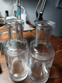 Si segnala che le ampolle risultano leggermente sbeccate (vedi ultime due foto), e il set è sprovvisto dei tappi che in origine facevano parte del set. Piccoli segni di usura del tempo. Discrete condizioni.