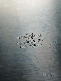 Set vintage per olio e aceto marca "Alessi", in cristallo e acciaio inossidabile. Il set include due ampolle per olio e aceto con un supporto in acciaio con logo Alessi.