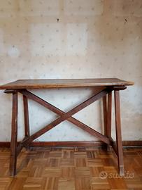 Vendo set composto da tavolo antico in legno e sedia vintage coordinata. Ideale per creare un angolo studio caratteristico, come consolle da ingresso o per arredare baite, taverne o locali in stile rustico/industrial. Dettagli dei pezzi: Tavolo a Fratino: Struttura in legno massiccio con tipica base a crociera (X). Piano con patina vissuta che conferisce un autentico fascino d'epoca. Dimensioni: L: 92,5 cm P: 42 cm A: 70 cm Sedia Vintage: Design elegante anni '50/'60 in legno scuro. Seduta in corda intrecciata a mano, in ottime condizioni e molto robusta. Schienale ergonomico a due fasce. Stato di conservazione: Entrambi i pezzi sono originali. Il tavolo presenta i segni del tempo che ne testimoniano l'autenticità (piccole imperfezioni del legno), mentre la sedia è pronta all'uso
