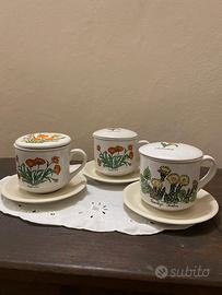 Nota: una delle tre tazze ha il coperchio leggermente scheggiato - difetto minimo, non visibile a distanza e che non compromette l’uso.