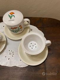 Set vintage di tre tazze/teiere da tisana in ceramica, ciascuna completa di filtro interno e coperchio abbinato.