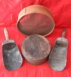 Vendo setacci e palette per farine e contenitore per farine in legno, condizioni come da foto, non male, un setaccio grande per cereali diametro 40 cm x 9 cm altezza, un setaccio per farina diametro 28,5 x 9 altezza, un porta farina in legno primi del '900 diametro 21 cm x 9 altezza, n. 2 palette o sessole porta farina primi del '900 in legno e lamiera, 1 lunga 38 cm larga dove prende la farina 11,5 cm, 1 lunga 37 cm larga dove prende la farina 12,5 cm. Peso totale palette 1 kg, Peso totale di tutti i pezzi 2,5 kg. Prezzo 85 euro in blocco. Spedizioni in tutta Italia ! ! ! Per ogni info e dettagli contatto SOLO VIA TELEFONO AL NUM. 349-0869294. PIETRO NO VIA E-MAIL.
