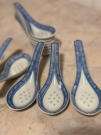 Vendo set completo di 12 cucchiai da zuppa cinesi in porcellana bianca con decorazioni blu in stile tradizionale asiatico.